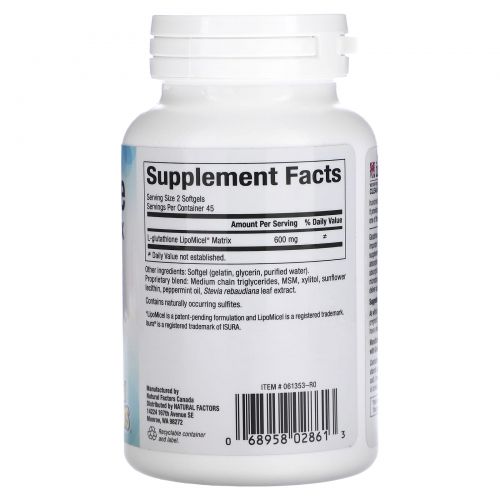 Описание товара Natural Factors, Glutathione LipoMicel Matrix, 300 мг, 90 мягких таблеток