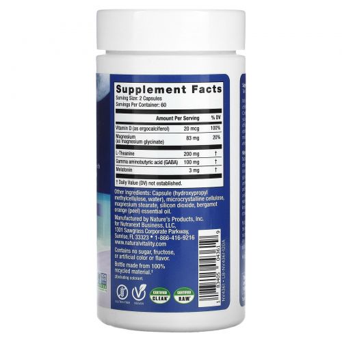 Капсулы для сна Natural Vitality Calm® были разработаны специально для тех случаев, когда нам нужна поддержка сна. В их состав входят глицинат магния, L-теанин (расслабляющая аминокислота), ГАМК (небелковая аминокислота) и мелатонин, которые помогают организму спокойно спать. Глицинат магния помогает восполнить запасы магния в организме. известно, что он лучше усваивается и легче переносится желудком, чем оксид магния.