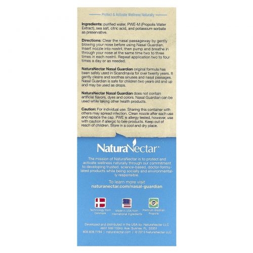 Nasal Guardian содержит оригинальную, проверенную временем скандинавскую формулу от Salomon Propolis, полученную из Бразилии. Назальные растворы с пчелиным прополисом использовались поколениями для очищения носовых и дыхательных путей. Спрей Nasal Guardian содержит эксклюзивный экстракт PWE-M (органические ароматические добавки из прополиса бразильской пчелы), который представляет собой нежный, но эффективный натуральный спрей на водной основе, который предлагает всей семье все полезные свойства пчелиного прополиса в изотоническом растворе, тщательно разработанном для облегчения и очистки носа, не повреждая его деликатную слизистую оболочку.