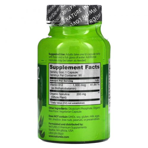 Описание товара NATURELO, Vegan B12 Infused with Spirulina, 90 Easy Swallow Capsules