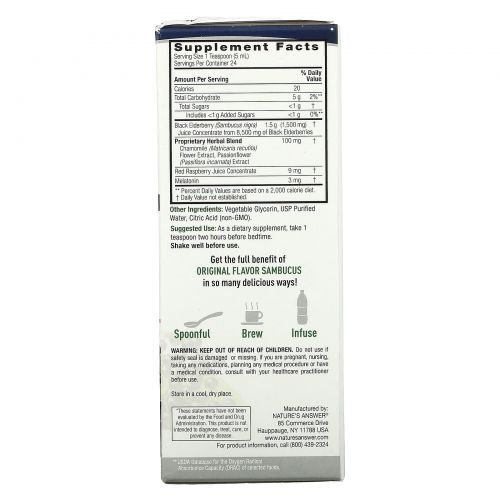 Описание товара Nature's Answer, Melatonin Sambucus, ночной сон и поддержка иммунной системы, 120 мл (4 жидк. Унции)