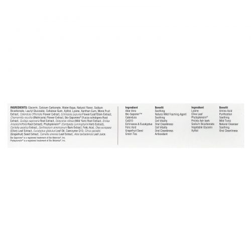 Другие Ингредиентыглицерин, карбонат кальция, вода / вода, натуральный ароматизатор, бикарбонат натрия, лаурил глюкозид, целлюлозная камедь, ксилитол, лизин, ксантановая камедь, экстракт архата, экстракт цветков календулы (Calendula officinalis), экстракт цветков / листьев / стебля эхинацеи куколки, экстракт цветков ромашки лекарственной (Chamomilla recutita), Bio-Saponins® (экстракт корня юкки Шидигера [Yucca schidigera], экстракт корня килайи мыльной (Quillaja saponaria), экстракт корня дикого ямса (Dioscorea villosa), экстракт корня смилакса (Smilax arisolochiiffolia), Phytoplenolin® (экстракт травы австралийской ромашки (Centipeda cunninghamii), экстракт готу колы (Centella asiatica), экстракт коры сычуаньского перца (Zanthoxylum americanum), фолиевая кислота, экстракт листьев оливкового дерева (Оlea europaea), масло из листьев эвкалипта шаровидного (Eucalyptus globulus), коэнзим Q10, экстракт косточек грейпфрута (Citrus paradisi), экстракт листьев камеллы китайской, сок листьев алоэ вера (Aloe barbadensis).
