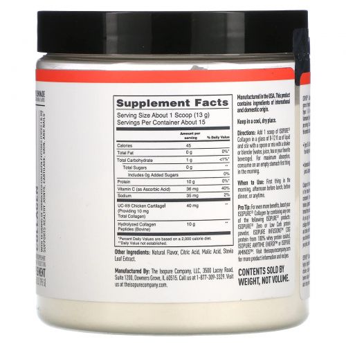 Isopure Collagen содержит 10 граммов гидролизованных пептидов коллагена (типа I & II) и 40 мг ингредиента неденатурированного коллагена типа II UC-II на порцию. Это удобный способ ощутить преимущества коллагена: