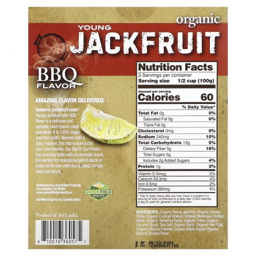 Описание товара Nature's Greatest Foods, Органический молодой джекфрут, со вкусом барбекю, 300 г (10 унций)