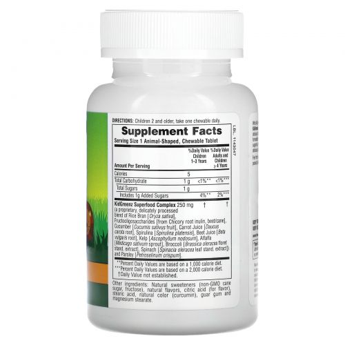 Препарат Animal Parade KidGreenz содержит сбалансированную смесь зеленых овощей и питательные продукты из океана. Вкусные жевательные таблетки KidGreenz заряжают ребенка энергией, они состоят из богатых фитонутриентами питательных веществ, растущих на суше и в море. В состав комплекса KidGreenz входят брокколи, шпинат, спирулина, хлорелла, ламинария и другие питательные ингредиенты, которые обычно отсутствуют в рационе ребенка. Содержащиеся в KidGreenz катализаторы роста молочных бактерий поддерживают здоровую микрофлору кишечника, которая необходима для здоровья и хорошего самочувствия малыша.