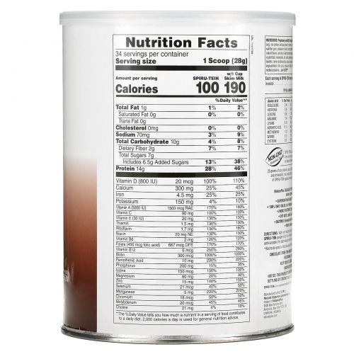 | ** Количество в порошке Spiru-Tein. Порция Spiru-Tein с обезжиренным молоком содержит 0 г жира, 5 мг холестерина, 173 мг натрия, 482 мг калия, 21 г углеводов (18 г сахара) и 22 г белка. *** Процент от суточной нормы при условии потребления 2000 калорий в день. | |||
