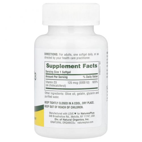 Описание товара Nature's Plus, Витамин D3, 5000 МЕ, 60 мягких желатиновых капсул