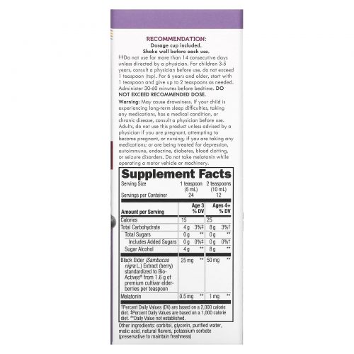 Описание товара Nature's Way, Sambucus for Kids, стандартизованный сироп для улучшения ночного сна из ягод бузины с мелатонином для детей, 120 мл (4 жидк. унции)
