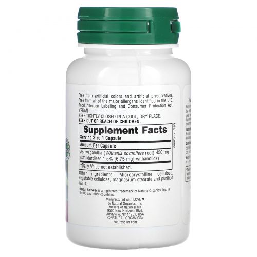 Описание товара NaturesPlus, Herbal Actives, ашваганда, 450 мг, 60 веганских капсул