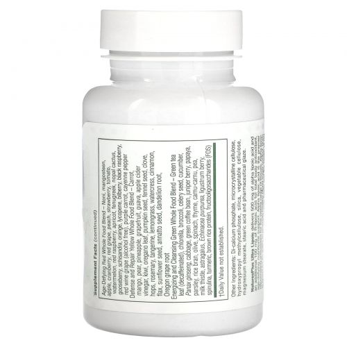 | Смесь из цельных продуктов полного спектра Синяя цельная пищевая смесь для поддержки мозга - асаи, гранат, свекольный сок, вишня, голубика, слива, ежевика, маракуйя, фиолетовый инжир, брусника, черная смородина, ацерола, агава, гибискус, капуста, корень ревеня, экстракт виноградных косточек, рожковое дерево, чернослив, шиповник, бузина, ежевика годжи Белая цельная пищевая смесь для повышения прочности и выносливости - лук, лимон, цветная капуста, финики, чеснок, имбирь, гриб шиитаке, репа, белый чай, банан, чиа, цитрусовый пектин, хрен, корень цикория, клетчатка корня конжака, акация, пастернак, Phaseolus vulgaris фасоль, шалфей, артишок, картофель, тапиока, стебель бамбука (Bambusa vulgaris), киноа Антивозрастная красная цельная пищевая смесь - нони, мангостан, яблоко, клюква, красный виноград, персик, клубника, томат, арбуз, красная малина, абрикос, пажитник, кактус нопал, крыжовник, лимонник, апельсин, ликопин, черника, черная малина, красное вино (без спирта), фиолетовая морковь, кайенский перец Желтая цельная пищевая смесь для защиты и восстановления - морковь, манго, груша, ананас, грейпфрут, гуава, яблочный уксус, киви, листья орегано, семена тыквы, семена фенхеля, гвоздика, хмель, розмарин, мандарин, лемонграсс, кресс-салат, корица, лен , семена подсолнечника, семена аннато, корень одуванчика, корень орегонского винограда Бодрящая и очищающая смесь зеленых цельных продуктов - листья зеленого чая (без кофеина), хлорелла, брокколи, семена сельдерея, огурец, женьшень обыкновенный, капуста, зеленые кофейные зерна, ягоды можжевельника, папайя, петрушка, рисовые отруби, оливки, шпинат, чабрец, каму каму, горох, расторопша, астрагал, эхинацея пурпурная, ягоды лигустра, спирулина, куркума, белок коричневого риса, фруктоолигосахариды (ФОС) | 50 мг | † |