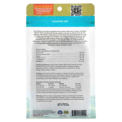Scoopables упакованы по вкусу и обладают восхитительным вкусом копченого бекона, идеально подходят для привередливых едоков и так же эффективны, как и наши оригинальные мягкие жевательные таблетки. Разработано ветеринаром и рекомендовано для собак старше 12 недель. Наша уникальная смесь тиамина и L-триптофана помогает снизить стресс и напряжение, мелатонин способствует отдыху и расслаблению, а имбирь помогает успокоить чувствительный желудок, что особенно важно во время путешествий. Помогает оказывать успокаивающее действие во время стрессовых ситуаций, например, шторма. фейерверки, путешествия и уход.