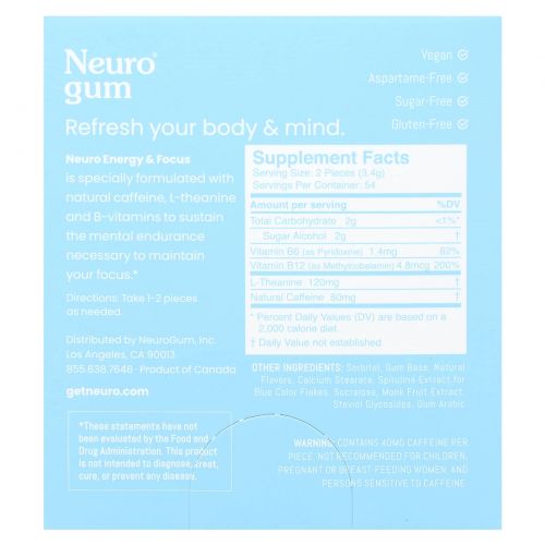 Neuro Energy & Focus содержит натуральный кофеин, L-теанин и витамины группы B, которые способствуют умственной выносливости, необходимой для сохранения концентрации внимания.