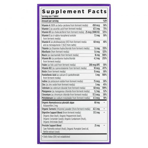 Продукт разработан экспертами для комплексной поддержки здоровья мужчин старше 55 лет. Содержит питательные вещества для поддержки здоровья мозга, костей, простаты, зрительной и пищеварительной системы, а также защиты от стресса. Комплекс витаминов дарит отличное настроение и поддерживает здоровье волос, кожи и ногтей. Не содержит железа.