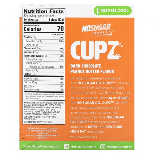 Описание товара No Sugar Company, Cupz, темный шоколад с арахисовой пастой, 30 шт. по 17 г (0,6 унции)