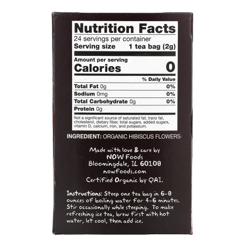 Описание товара Now Foods, Настоящий натуральный чай с цветами гибискуса, не содержит кофеина, 24 чайных пакетика, 1,7 унции (48 г)