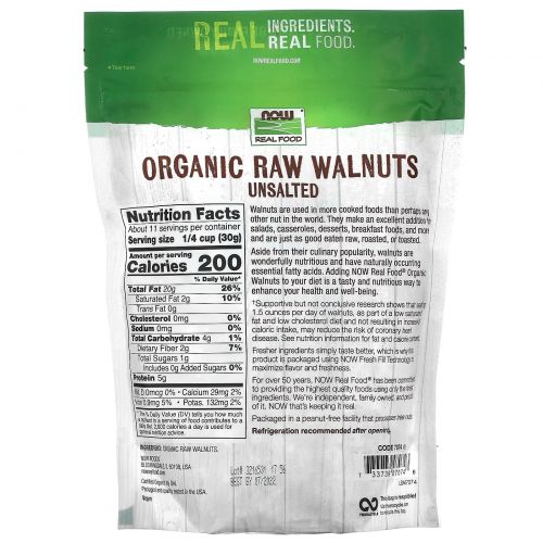 Описание товара NOW Foods, Real Food, Сертифицированные органические сырые грецкие орехи, несоленые, 12 унций (340 г)