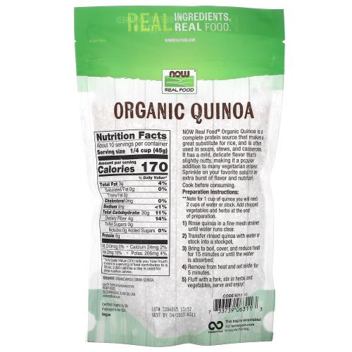 Описание товара Now Foods, Сертифицированная органическая киноа, Цельный злак, 16 унций (454 г)