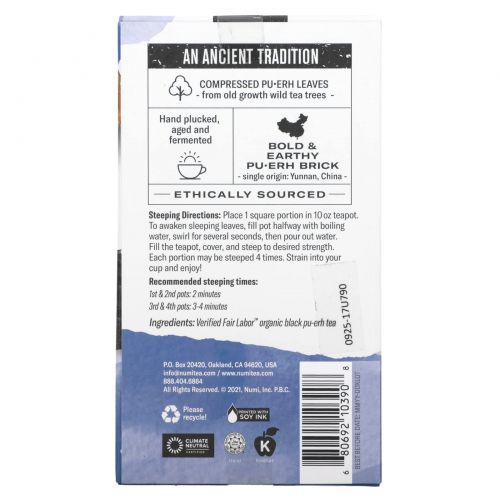 Описание товара Numi Tea, Органический чай пуэр, высокое содержание кофеина, плитка зрелого чая пуэр, 2,2 унции (63 г)
