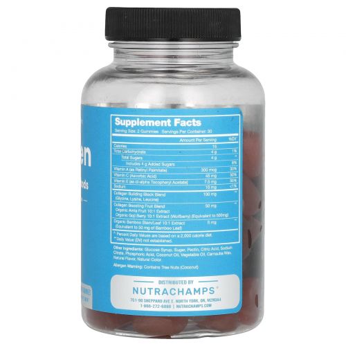 Описание товара NutraChamps, жевательные таблетки с коллагеном, повышающие уровень суперфудов, со вкусом персика, 60 жевательных таблеток с витаминами