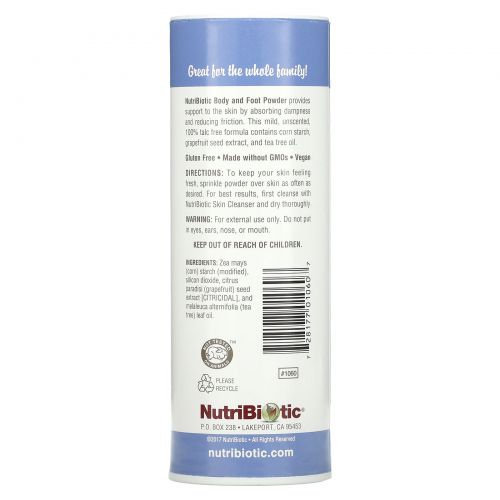 Пудра для тела и ног NutriBiotic поддерживает кожу, впитывая влагу и уменьшая трение. Эта мягкая формула без запаха и 100% без талька содержит кукурузный крахмал, экстракт косточек грейпфрута и масло чайного дерева.