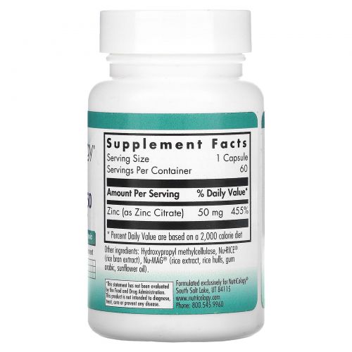 Nutricology, Цитрат цинка 50, 60 растительных капсул