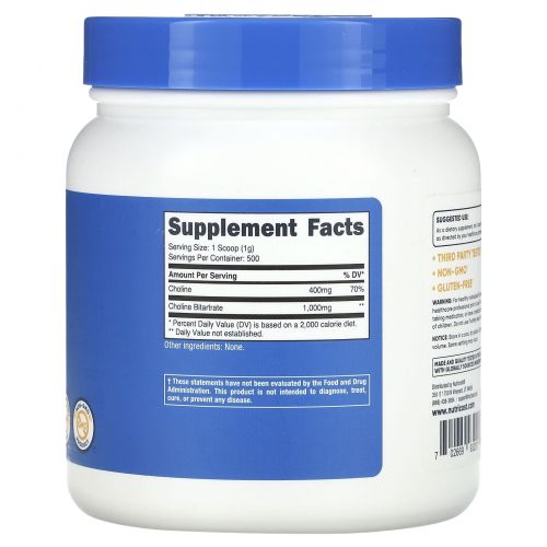 Описание товара Nutricost, холин битартрат, без добавок, 500 г (1,1 фунта)