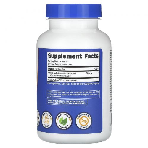 Nutricost, натуральный кофеин, 200 мг, 250 капсул