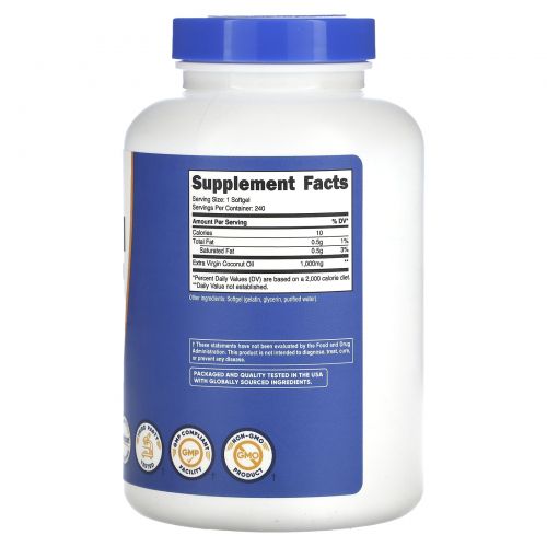 Nutricost, нерафинированное кокосовое масло высшего качества, 1000 мг, 240 капсул