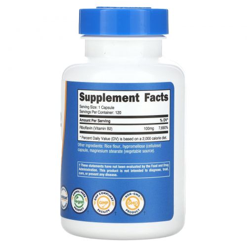 Nutricost, Витамин B2, рибофлавин, 100 мг, 120 капсул