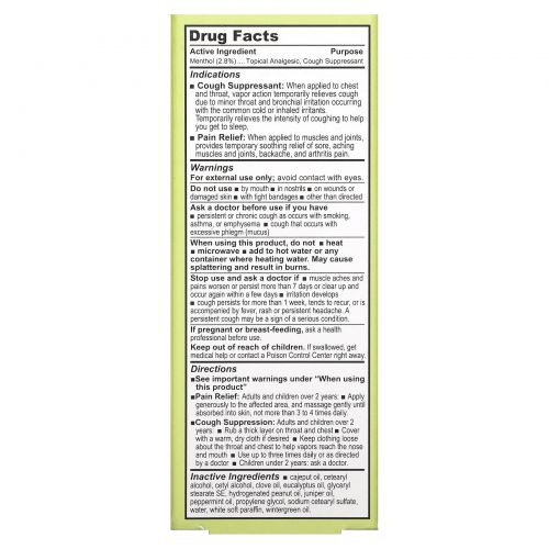 Подавление кашля. Взрослые и дети старше 2 лет: Нанесите толстым слоем средство на горло и грудь. При желании накройте теплой сухой тканью. Одежда должна свободно прилегать к горлу и груди, чтобы пары могли достигать носа и рта. Используйте до трех раз в день или в соответствии с рекомендациями врача. Детям до 2 лет: проконсультироваться с врачом.