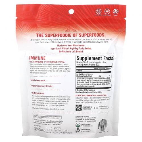 Описание товара Om Mushrooms, Сертифицированный органический грибной порошок, для иммунитета, 200 г (7,05 унции)