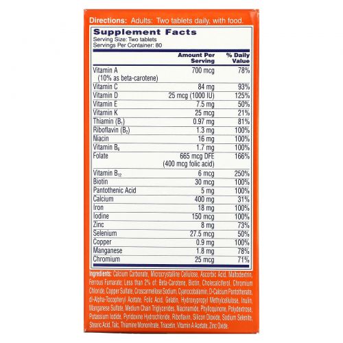 Карбонат кальция, микрокристаллическая целлюлоза, аскорбиновая кислота, мальтодекстрин, fошибочный фумарат,; Менее 2%: Бета-каротин, биотин, холекальциферол, хлорид хрома, сульфат меди, кроскармеллоза натрия, цианокобаламин, d-пантотенат кальция, dl-альфа-токоферилацетат, фолиевая кислота, желатин, гидроксипропилметилцеллюлоза, инулин, сульфат марганца, среднецепочечные триглицериды, никотинамид, филлохинон, полидекстроза, йодид калия, пиридоксина гидрохлорида, рибофлавина, диоксид кремния, селенит натрия, стеариновая кислота, тальк, мононитрат тиамина, триацетин, ацетат витамина A, оксид цинка.