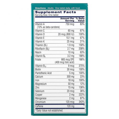 Карбонат кальция, микрокристаллическая целлюлоза, кофеин, оксид магния, аскорбиновая кислота, фумарат железа, мальтодекстрина, кроскармеллоза натрия; менее 2% бета-каротина, биотин, холекальциферол, хлорид хрома, сульфата меди, цианокобаламин, d-пантотенат кальция, dl-альфа-токоферил ацетат, FD&C Blue # 1 Aluminium Lake, краситель красный 40 FD&C алюминиевый лак, краситель желтый 5 FD&C алюминиевый лак (тартразин), фолиевая кислота, желатин, гидроксипропилметилцеллюлоза, сульфат марганца, никотинамид, филлохинона, полиэтиленгликоля, поливинилполипирролидон, пиридоксина гидрохлорида, рибофлавина, диоксид кремния, селенит натрия, стеариновая кислота, мононитрат тиамина, диоксид титана (краситель), ацетат витамина A, оксид цинка.