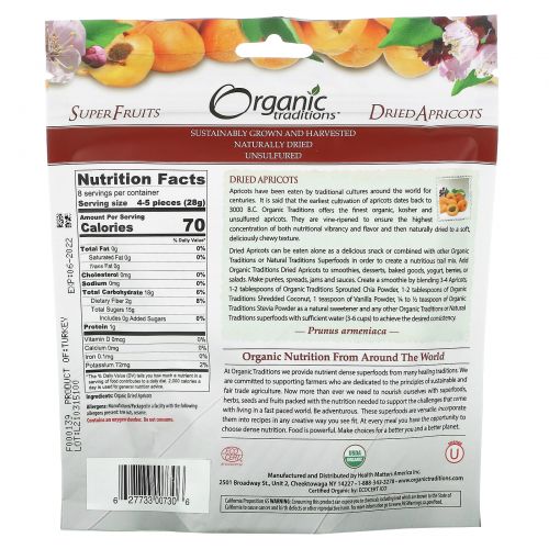 Абрикосы веками употреблялись в пищу представителями традиционных культур по всему миру. Говорят, что первые выращивания абрикосов относятся к 3000 году до нашей эры. Organic Traditions предлагает лучшие органические, кошерные и несульфированные абрикосы. Они созревают в виноградной лозе, чтобы обеспечить максимальную концентрацию питательной энергии и вкуса, а затем сушатся естественным путем до мягкой, восхитительно жевательной текстуры.