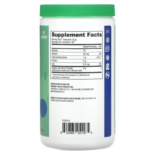 Описание товара Organika, Органическая спирулина, сине-зеленые водоросли, 500 г (17,64 унции)