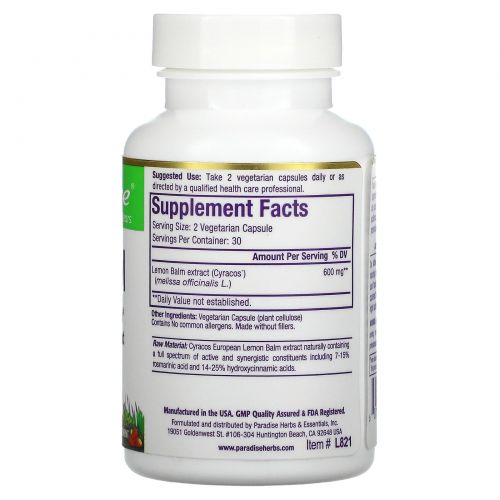 Описание товара Paradise Herbs, Европейская мята лимонная, 60 вегетарианских капсул
