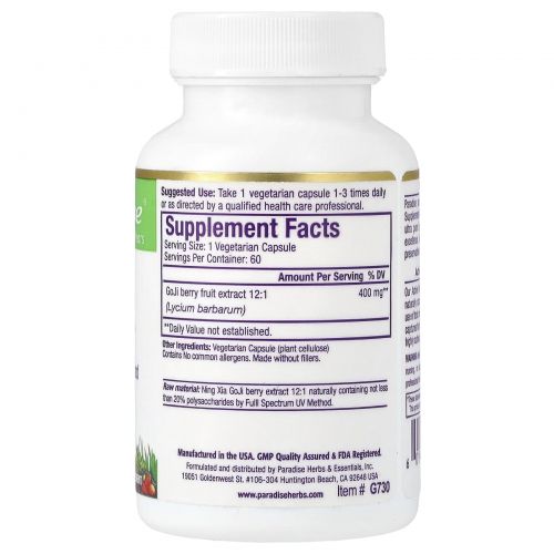 Описание товара Paradise Herbs, Го джи, 100% чистоты, 60 растительных капсул