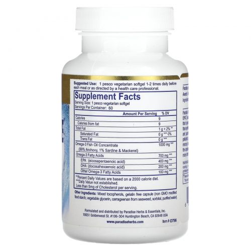 Описание товара Paradise Herbs, Омега-3, 1000 мг, 60 жидких капсул на растительной основе