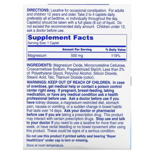 ПредупрежденияХранить в недоступном для детей месте. В случае передозировки, немедленно обратитесь за медицинской помощью или свяжитесь с токсикологическим центром. Перед применением во время беременности или кормления грудью, приема медицинских препаратов, а также при наличии каких-либо заболеваний следует проконсультироваться с врачом. Проконсультируйтесь с врачом перед использованием, если у вас есть заболевания почек, диета с ограничением магния, боль в желудке, тошнота или рвота, а также резкое изменение режима работы кишечника, которое сохраняется в течение 14 дней. Перед применением проконсультируйтесь с врачом или фармацевтом, если вы принимаете рецептурный препарат. Этот продукт может взаимодействовать с некоторыми препаратами, отпускаемыми по рецепту. Прекратите использование и поговорите с врачом, если вам необходимо использовать слабительное более одной недели, или у вас есть ректальное кровотечение или нет дефекации после использования этого продукта. Это может быть признаком серьезного заболевания.
