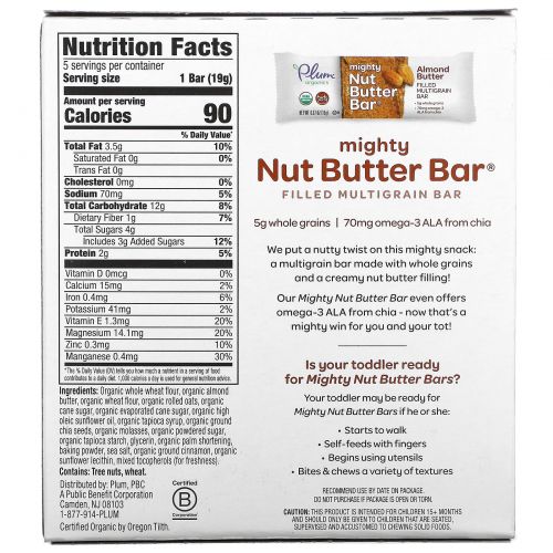Описание товара Plum Organics, Mighty Nut Butter Bar, Tots 15 Months & Up, Almond Butter, 5 Bars, 0.67 oz (19 g) Each