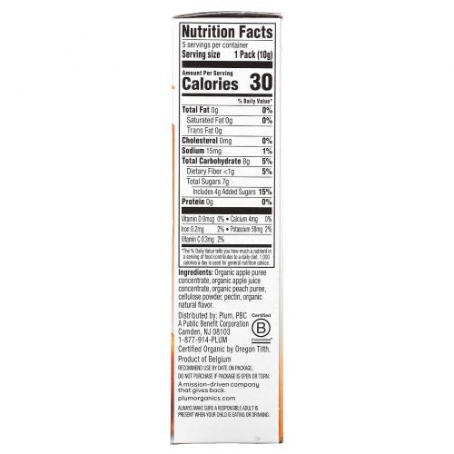 Описание товара Plum Organics, Tots, фруктовые кусочки, персик, 5 упаковок, 0,35 унции (10 г) каждая