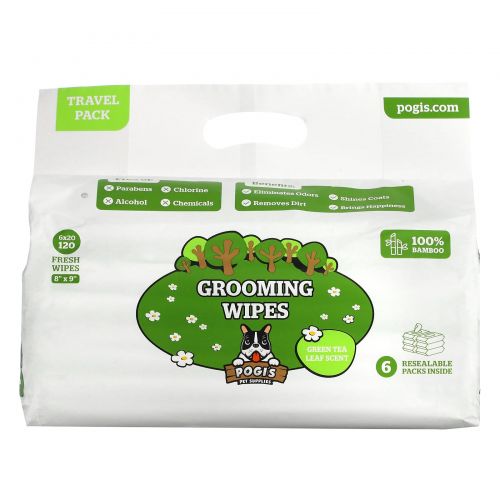 Описание товара Pogi's Pet Supplies, Салфетки для ухода, дорожный пакет, листья зеленого чая, 6 упаковок, 20 свежих салфеток в каждом