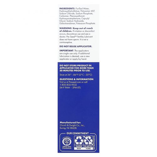 Хранить в недоступном для детей месте. При возникновении раздражения или дискомфорта следует прекратить использование и обратиться к врачу. Смазка для повышения фертильности Pre-Seed™ не воздействует на сперматозоиды. Он не является противозачаточным средством.