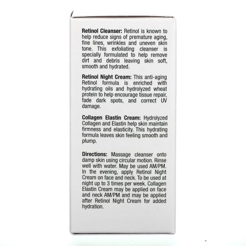 Массажными круговыми движениями нанесите очищающее средство на влажную кожу. Тщательно смойте водой. Можно использовать утром и вечером. Вечером нанесите ночной крем с ретинолом на лицо и шею. Можно использовать на ночь до 3 раз в неделю. Крем с коллагеном и эластином можно наносить на лицо и шею утром и вечером, а также после ночного крема с ретинолом для дополнительного увлажнения.