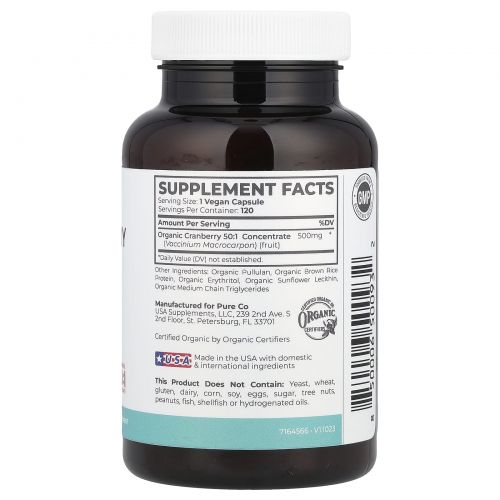 Pure Co., Органический концентрат клюквы, 500 мг, 120 веганских капсул