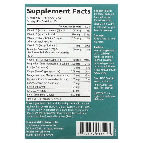 Описание товара Pure Essence, Ionic-Fizz, Magnesium Plus, малиновый лимонад, 15 стиков по 5,7 г (0,2 унции)