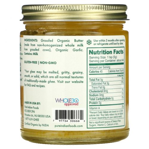 Описание товара Pure Indian Foods, Выращено органически Гхи с чесноком, 7.8 унции (220 г)