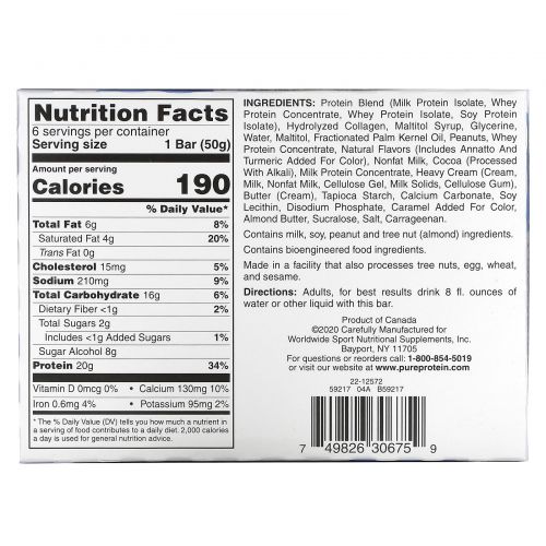 Описание товара Pure Protein, Батончики с арахисом, шоколадом и карамелью, 6 батончиков, 1,76 унц. (50 г)