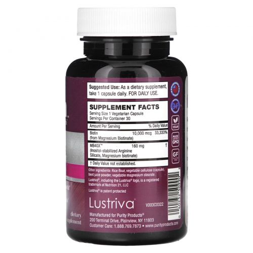 Описание товара Purity Products, MyBiotin, средство для здоровья волос, кожи и ногтей, 30 вегетарианских капсул