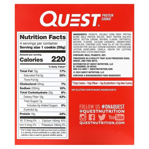 Описание товара Quest Nutrition, Protein Cookie, арахисовая паста, 4 пакетика по 58 г (2,04 унции)